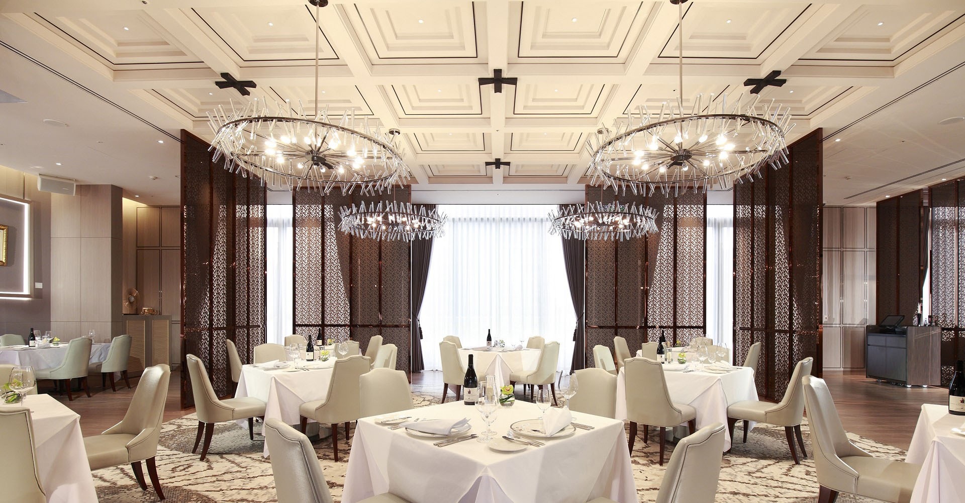 餐廳內部以茶金色屏風搭配大面落地窗,讓自然光溫柔灑落,用餐時彷彿置身於陽光明媚的地中海沿岸,氛圍優雅而舒適。
